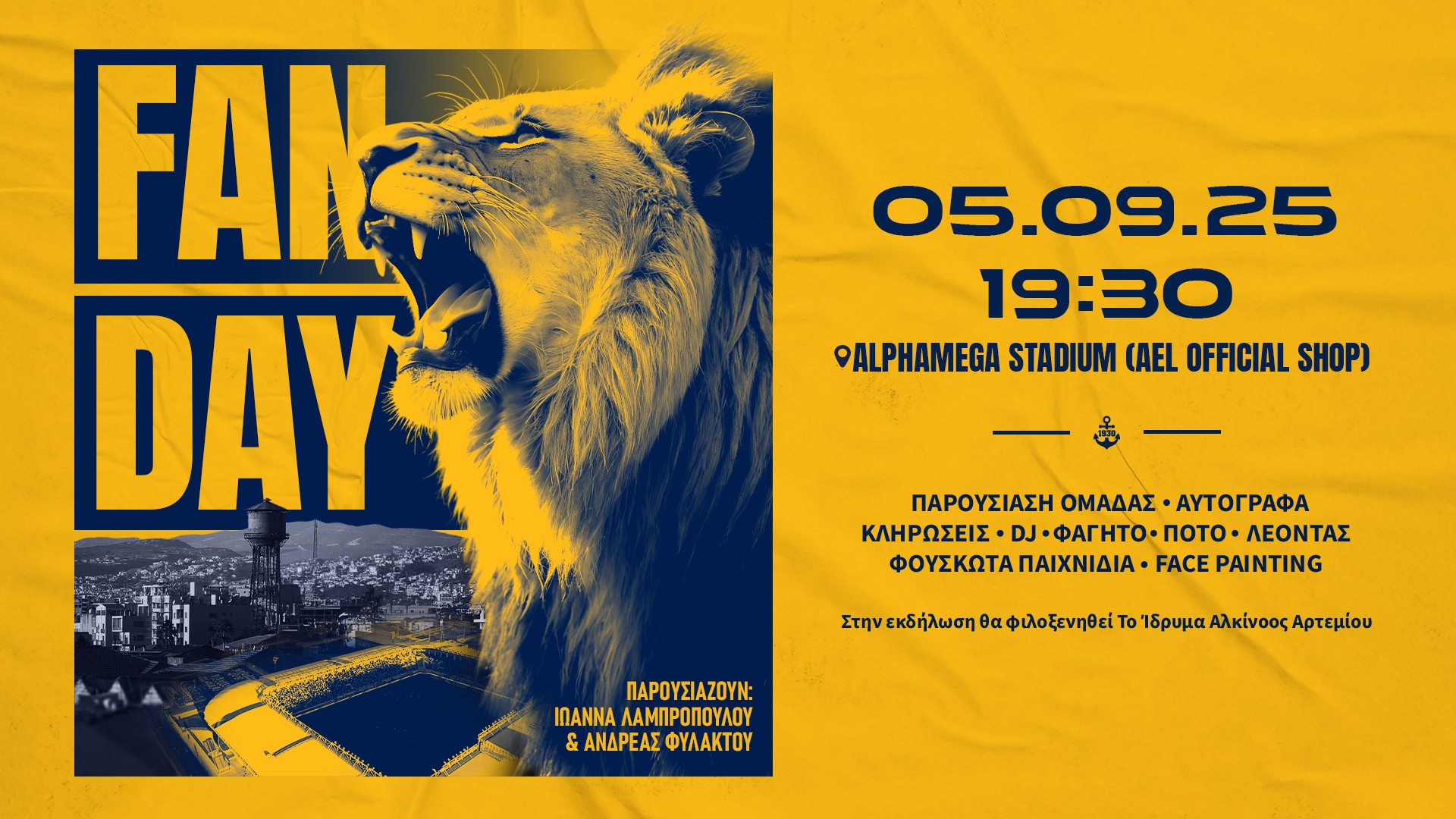 Το Fan Day θα πραγματοποιηθεί την Παρασκευή 05 Σεπτεμβρίου 2025 και ώρα 19:30, έξω από το AEL Official Shop στο Στάδιο Alphamega.