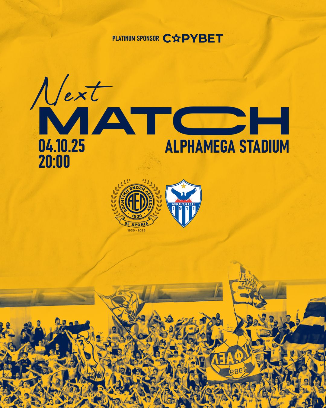 Η Αθλητική Ένωση Λεμεσού ανακοινώνει τις λεπτομέρειες της προπώλησης των εισιτηρίων για τον αγώνα ΑΕΛ – Ανόρθωση που είναι προγραμματισμένος για το Σάββατο 04/10/2025 στις 20:00 στο «Στάδιο ΑΛΦΑΜΕΓΑ», στο πλαίσιο της 6ης αγωνιστικής της Cyprus League 2025/26.